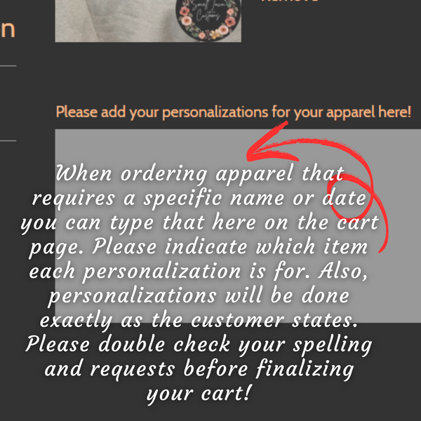 *Please write your personalizations in the text box on the "cart page" as indicated in the photo.*
